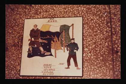 Colour photograph of a drawing depicting a soldier, a paramilitary soldier, the Starry Plough flag, the Sunburst flag, and the Irish flag, and the words, ‘1916 1975. To Mary from your loving husband Hughie’