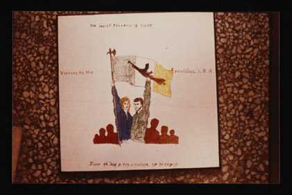 Colour photograph of a drawing of a woman holding an Irish flag, a man holding a rifle, and ‘The year of Freedom is near. Victory to the Provisional I.R.A.’