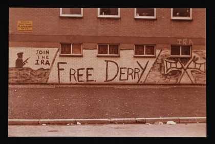 Colour photograph of a wall in Derry, Northern Ireland painted with the words, ‘Join the IRA’, and ‘Free Derry’