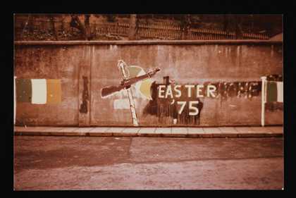 Colour photograph of a wall in Northern Ireland painted with an Irish flags, a rifle, and ‘Easter ‘75’