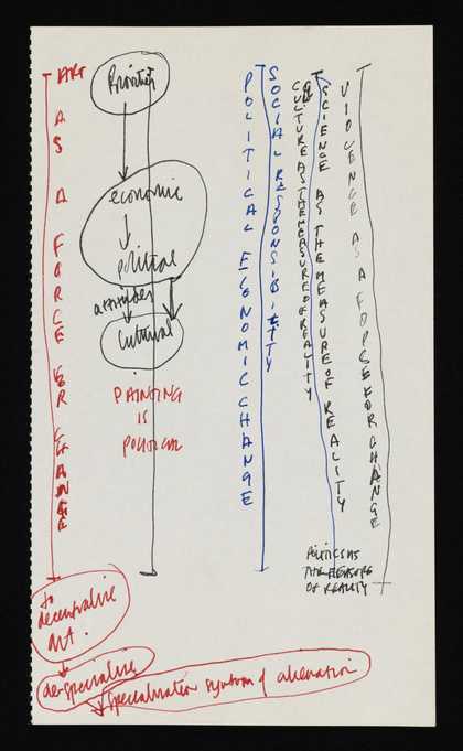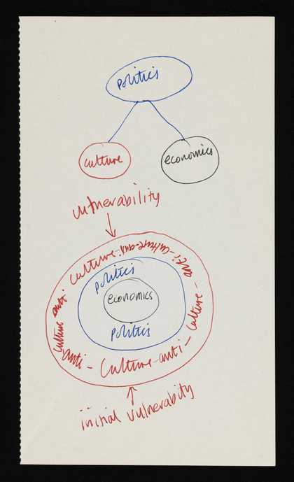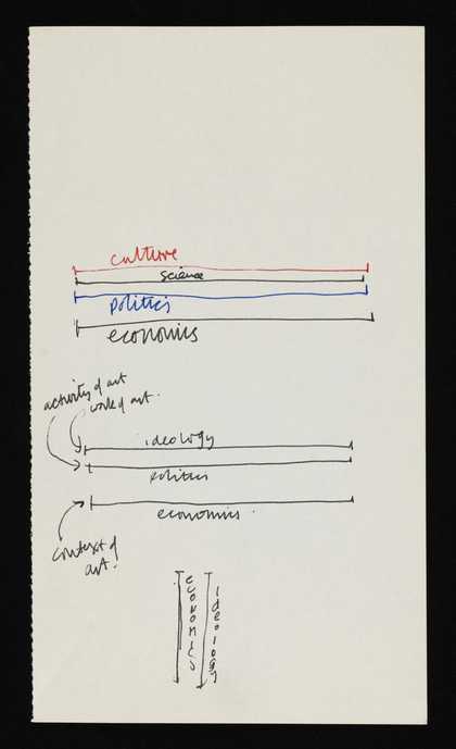 Sketch of a diagram illustrating the relationship between economics, politics, ideology, science, and culture in Northern Ireland by Conrad Atkinson for the exhibition catalogue, ‘A Shade of Green, An Orange Edge’
