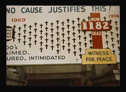 Colour photograph of a billboard illustrating the number of people killed during the troubles in Northern Ireland, with the caption, ‘No Cause Justifies This!’