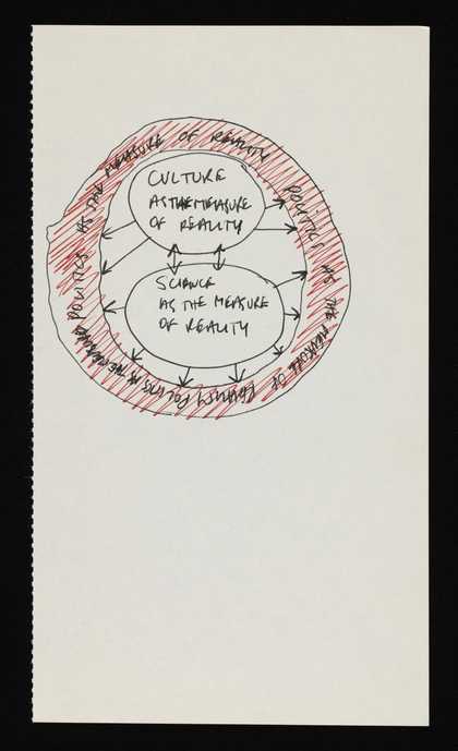 Sketch of a diagram illustrating the relationship between culture, science and politics as the measure of reality in Northern Ireland by Conrad Atkinson for the exhibition catalogue, ‘A Shade of Green, An Orange Edge’