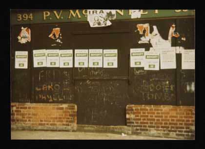 Colour photograph of a boarded up pub in Northern Ireland covered in posters which read, ‘Boycott’