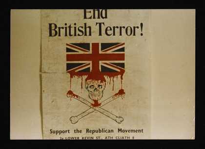Colour photograph of a poster depicting a Union Jack flag with blood dripping onto a skull and crossbones, and the caption, ‘End British Terror! Support the Republican Movement’