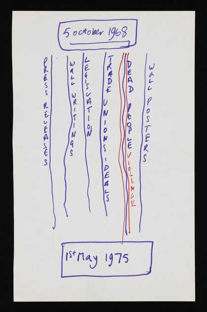 Items chosen from this collection for digitisation include photographs of wall murals, posters, and graffiti Northern Ireland, taken by Conrad Atkinson during the 'Troubles' in the early 1970s, as well as source material and original sketches by the artist for the exhibition catalogue for 'A Shade of Green, An Orange Edge', at the Art Council Gallery, Belfast, 1975. Also chosen are writings and organisational documentation relating to the formation and activities of the Artists' Union.