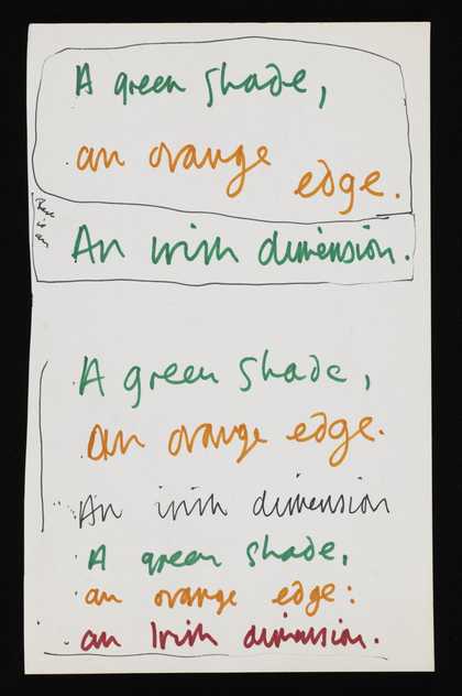 Artwork using words to illustrate the ‘Troubles’ in Northern Ireland by Conrad Atkinson for the exhibition catalogue, ‘A Shade of Green, An Orange Edge’