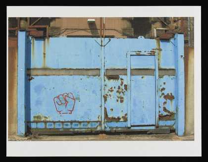 Colour photograph of a blue metal door, painted with a red clenched fist