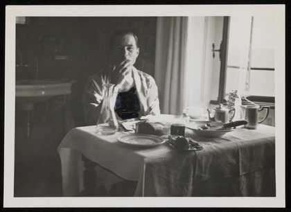 Photograph of Siegfried Sebba sitting at a table, smoking