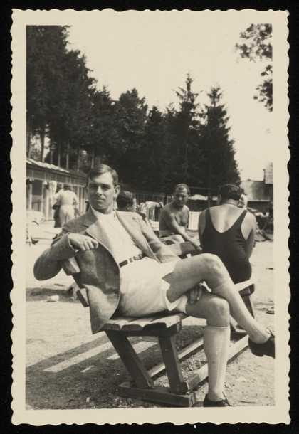 Photograph of Siegfried Sebba seated on a bench at a beach