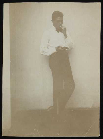 Photograph of Siegfried Sebba leaning on a wall smoking a cigarette