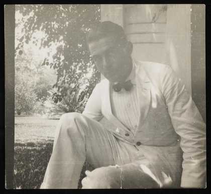 Photograph of Siegfried Sebba seated next to a pillar overlooking a garden