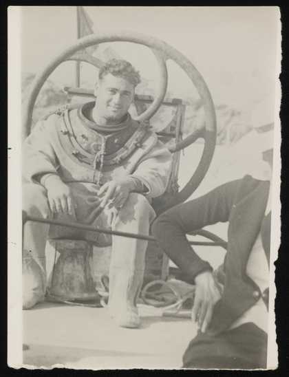 Photograph of Siegfried Sebba seated on the deck of a ship, dressed in a diving suit