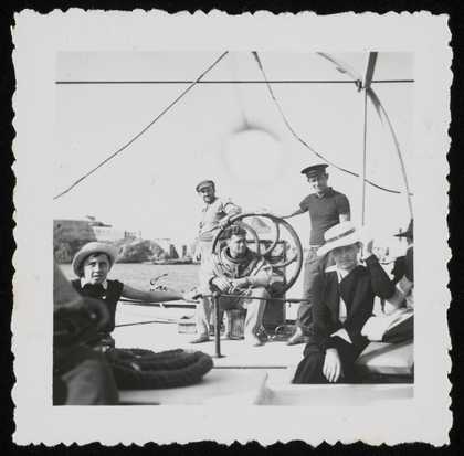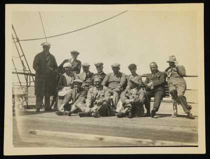 Group photograph taken on the deck of a ship including Siegfried Sebba