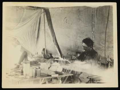 Photograph of Siegfried Sebba and another man in a tent, one lying on a cot, the other writing and smoking