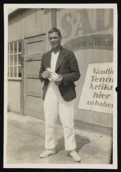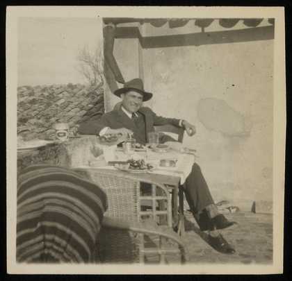 Photograph of Siegfried Sebba seated at a table on a balcony