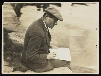 Photograph of Siegfried Sebba seated at the edge of a pond sketching