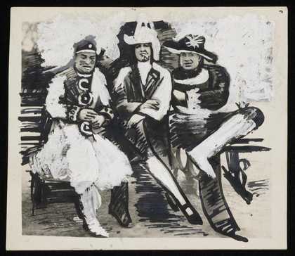 Photograph of three people, apparently wearing fancy dress, with alterations made to the photograph in white gouache and black ink