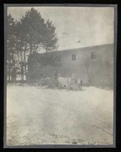 Photograph of oxen with a cart outside Villa Todesco in the snow, in Hinterbrühl, Austria