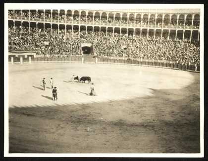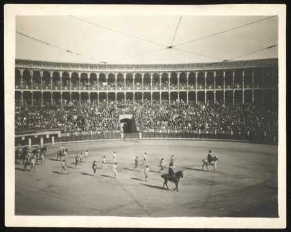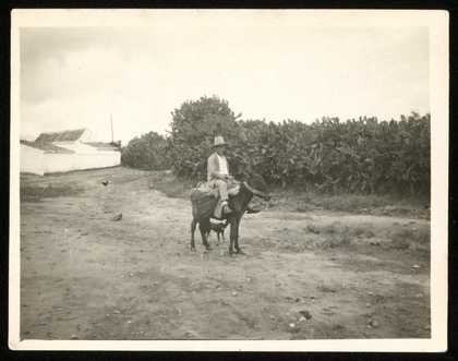 Photograph of an unidentified man riding a donkey in a field in Spain
