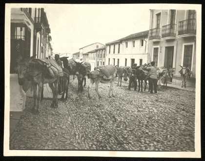 Photograph of a group of donkeys and three people, standing in a street in Spain