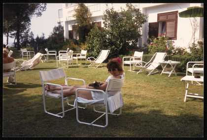 Photograph of a unidentified woman sitting outside in a chair with a cat on her lap, in Turkey