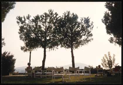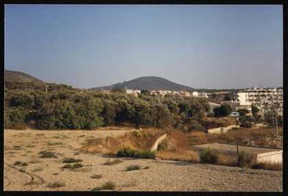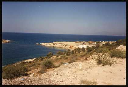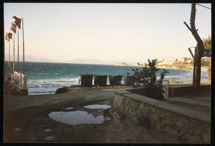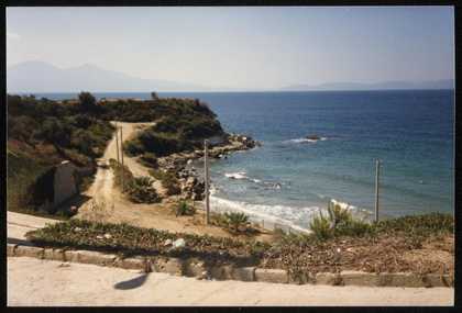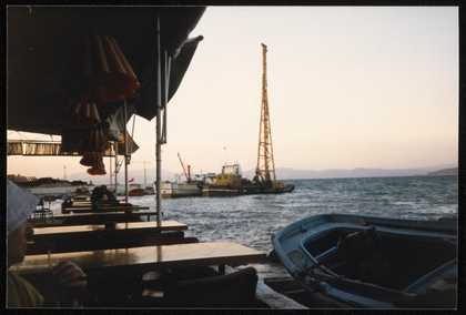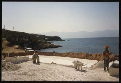 Photograph of two unidentified men working on a building site by the coast in Turkey