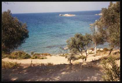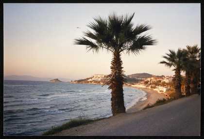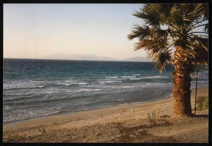 Photograph of the sea with hills in the distance and a palm tree on the beach, in Turkey