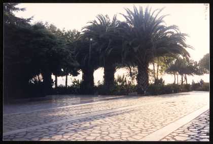 Photograph of of palm trees edging a paved courtyard in Turkey