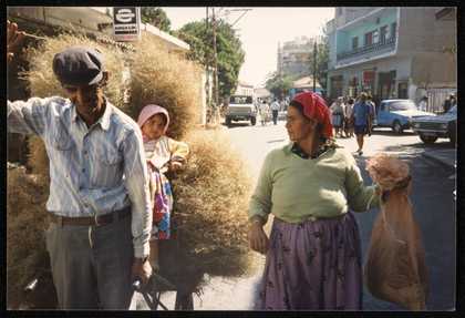 Photograph of a man pulling a hay-cart with young girl sitting on it and a woman walking beside them, in Turkey