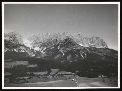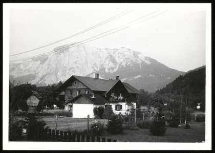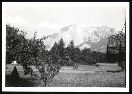 Photograph of a small hut in a field with a mountain in the distance in Austria