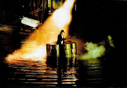Percussionist Z’ev performs in Bow Gamelan Ensemble’s Offshore Rig 1987 staged around Lot’s Ait island, River Thames