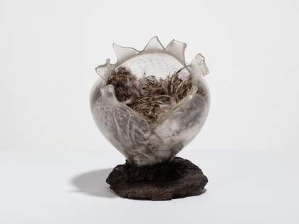 In 2012, I began working with Vapourshield, a composite of mica and stainless steel invented by my husband, Stephen Weiss, for use in non-ferrous casting. I poured molten glass onto a sheet of it to see how the two materials might react – the glass exploded into a strange bubbling dance. The resultant materials were very fragile and had to be cast into clear resin blocks to survive. Positioning them in resin blocks allowed me to create Catastrophic Encounters 2022.