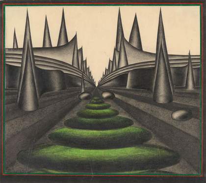 Gardens with Green Garden Sculpture 1966–9 might be my favourite artwork by Colin Self. I’d never seen this drawing in real life until I walked around the current retrospective at Norwich Castle. It’s smaller than I had imagined, and so mysterious. When I look at it, I see a Japanese Zen garden and a 1970s sci-fi paperback cover. Then there’s the looming modernist architecture, which looks a bit like Preston Bus Station. This picture looks like a gaming board, and like a Nazi death machine. It’s just full of information.