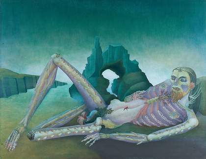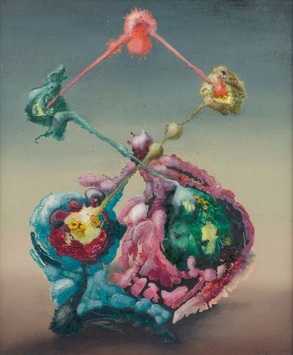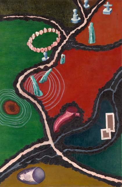 Colquhoun first encountered surrealism in Paris in 1931, and this inspired her to make other-worldly paintings of exotic plants in a style she described as ‘magic realism’. After visiting the International Surrealist Exhibition in London in summer 1936, inspired by Salvador Dalí, she began to explore surrealist methods such as the double image, where an object could be simultaneously read in two ways. Her painting Scylla 1938, in Tate’s collection, is the best-known of these, depicting both a boat sailing between two phallic rocks and the artist’s legs in a bath.
