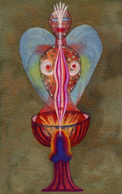 I’m sure Carl Jung and Sigmund Freud knew of the language and sacred texts of Tantra, just as I’m sure the surrealists looked at the imagery. Colquhoun did both, I imagine, and understood that she could tap into things, perhaps higher forces, that would bring her work into being. Powers, that is, that summon all the convergences of life to paper and body, hand and mind, in the automatism that Colquhoun learnt to trust in her work as messages and codes. She had faith in the potential of what could come to be, and if there were few clear directions, no matter: she made her own, harnessing her body as her own sacred instrument, much as a hatha yogini would. I see it in the work because I feel it in the work. This is the potential art has to cross every axis – to make you feel form and colour, negation and presence. And so Colquhoun’s works become thresholds of possibility and openings of doors.