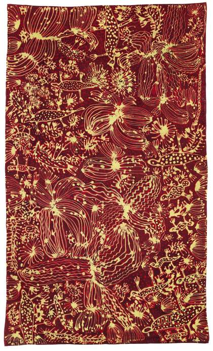In the many vibrant batik works that Kngwarray produced over a decade, she continued to lay out the groundwork of her Country. Literally drawn into the frame of some of these works on cotton and silk are key emblematic references to the flora and fauna of her Country, as well as her identity as a woman from Alhalker. In an untitled textile work of 1981, mirrored, trailing lines are linked by a bulbous node and cast delicate webs, suggesting both the above-ground and underground plant growth of anwerlarr and kam. Here, too, are other creatures of Alhalker, including centipedes, lizards and emus, all etched in gold against the dyed deep reds resonant of desert sand. The opportunity to document and share the beauty and power of her Country in a new medium and for new audiences seems to have inspired the fulsomeness of the subject matter Kngwarray depicted in her early batik works.