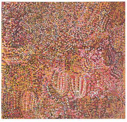 Within the context of a flourishing, and often unethical, commercial Aboriginal arts sector, Kngwarray continued to confound and stimulate audiences in Australia as well as around the world. Her style evolved rapidly as she repeatedly tapped the deep wellspring of culture and creativity that is Alhalker Country. For instance, the stippled works made between 1990 and 1991 are enlarged and elongated in comparison to earlier paintings. Within these elegant paintings, distinctive motifs such as the anwerlarr tubers and emu footprints are submerged or disappear completely in favour of billowing fields of dots that expand or contract across the surface of the canvas.