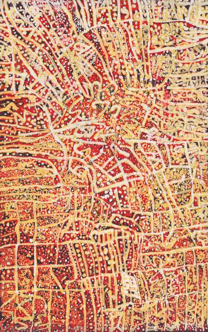 In the iconography contained in her early composite batik works, Kngwarray revealed the group of glyphs – dots, striae, grids and meanders – that comprise her artistic alphabet. A series of striped works from 1994 capture this idea of the ‘pulling apart’ of layers. These works, loosely documented as awely or body marking, demonstrate an aesthetic approach in which precision appears to be forfeited for texture.