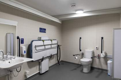 The inside of the Changing Places accessible toilet. The room includes a hoist. Photo © Tate (Josh Croll)