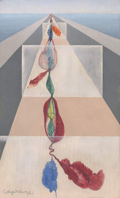 Colquhoun held two exhibitions of her automatic works at the Mayor Gallery in 1947. In March she exhibited paintings and in December she presented drawings. Many of these works are on display nearby (indicated on artwork labels). Colquhoun created them using techniques such as decalcomania and superautomatism, in which the image is begun without conscious thought.