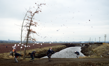 Jeff Wall is celebrated for his signature large-scale photographs on lightboxes. Trained in art history, he is a member of a group of artists known as the Vancouver School. A Sudden Gust of Wind (After Hokusai) (1993) is a vivid snapshot of ordinary life with four animated figures frozen, caught suddenly in a sweeping gust of wind. However, the photo is carefully staged. Wall took photos of actors on windy days and collaged and digitally superimposed parts of the image together, like the carefully placed sheets of paper blowing through the air.