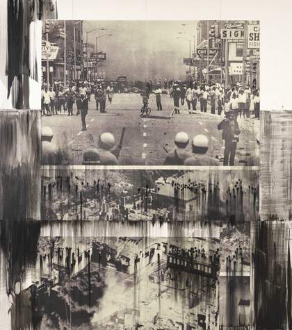 Many artists look at media from the past to create timely artwork that reflects the world today. Lorna Simpson uses multimedia to highlight issues from racism to international conflicts in the news. In Then and Now (2016), Simpson takes a photo from the Detroit riots in 1967 to create a screen-printed panel of images of police and protesters. In her artwork, the protesters notably appear powerless, covered in burnt-out foreboding dark shadows. Simpson made this piece when similar acts of rebellion were happening in the US – mirroring the riots that took place 50 years before.