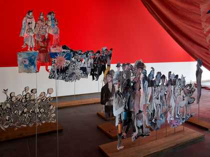 This immersive exhibition features dramatic large-scale installations of paintings on sailcloth and papier-mache sculptures, alongside more intimate displays of artist books and elements of her own studio.